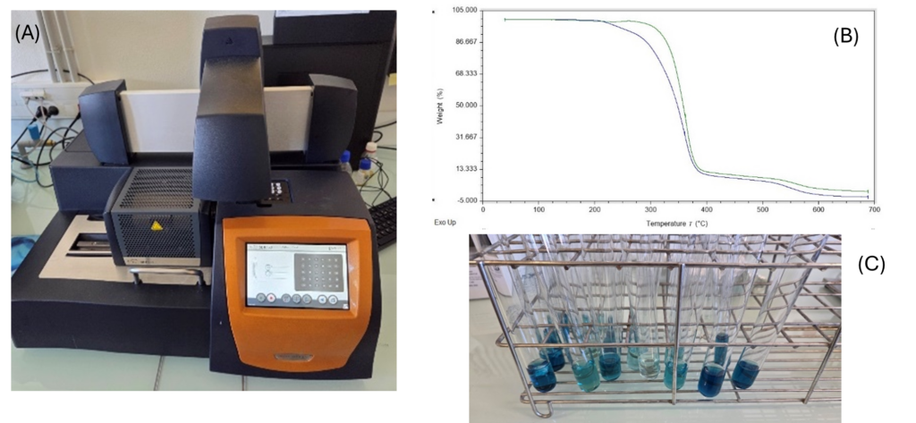 Figuur 2: (A) ATG – (B) Niet-geadditeerde FACEs (blauw) / Geadditeerde FACEs (groen) – (C) Antioxidanttest.